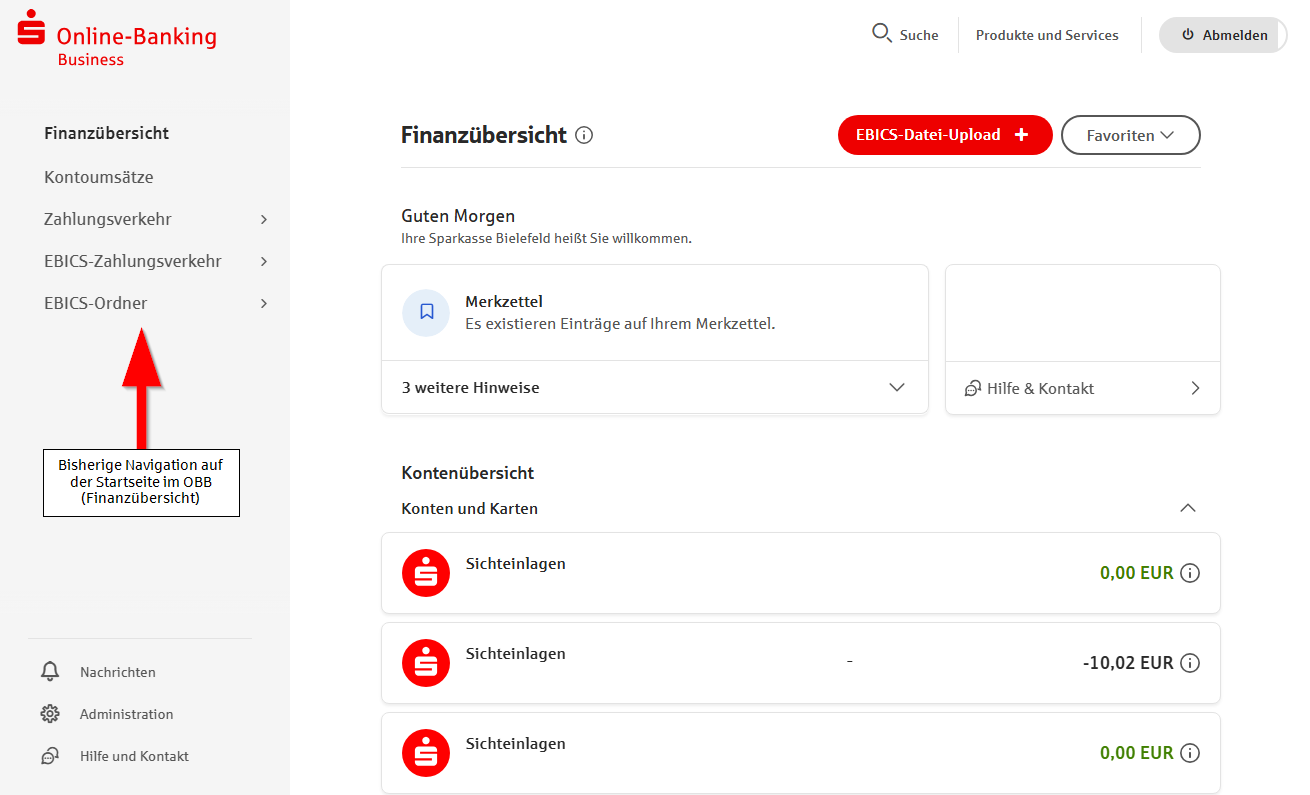 Unser Online-Banking Business (OBB) ist Online-Banking speziell für Unternehmen und gewerbliche Kunden. Es bietet zahlreiche Funktionen und Möglichkeiten, die im normalen Online-Banking für Privatkunden nicht zur Verfügung stehen. In einigen Tagen nehmen wir ein Änderung an der Navigation im OBB vor.